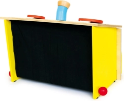 Škatla ima tekstilne odprtine za roke, ki otrokom omogočajo urjenje tipa.