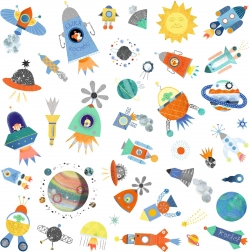 Odkrijte vesoljsko zabavo s kreativnimi nalepkami znamke DJECO. Te nalepke ponujajo zabavno in poučno dejavnost za otroke, ki spodbuja njihovo domišljijo.