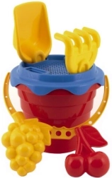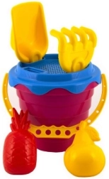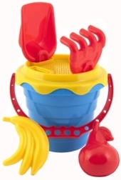 V kompletu najdete vse potrebno za igranje s peskom, vključno z vedrom, sitkom, lopatico, grabljami in dvema modelčkoma.