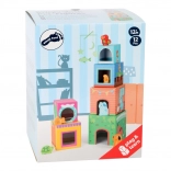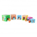 Barvit sestavljivi komplet z kartonskimi kockami in šestimi lesenimi živalmi za najmlajše. Otroci zlagajo od največje do najmanjše in urijo fino motoriko, koordinacijo oko–roka ter logično razmišljanje. Vsaka žival najde svoj pravi domek v ustrezni odprtini. Varna igrača za otroke od 12 mesecev.