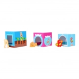 Šest prikupnih lesenih živali spada v ustrezne odprtine v kockah. Otroci vadijo razvrščanje, ujemanje in domišljijsko igro.