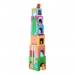 Ta čudovit sestavljivi stolp iz trpežnih kartonskih kock in lesenih živali uči otroke razvrščati velikosti, presojati prostor in uriti spretnost. Kocke postavite od največje do najmanjše v stabilen stolp visok do približno 58 cm, zahvaljujoč odprtinam v kockah pa vanje otroci vstavljajo ustrezne živali.