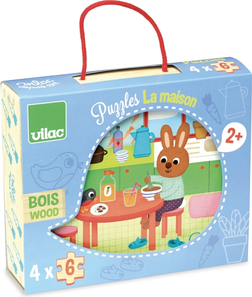Lesene sestavljanke VILAC za otroke od 2 let: 4 kompleti po 6 koščkov z motivi doma v praktični leseni škatli z ročajem. Razvoj motorike in logike.
