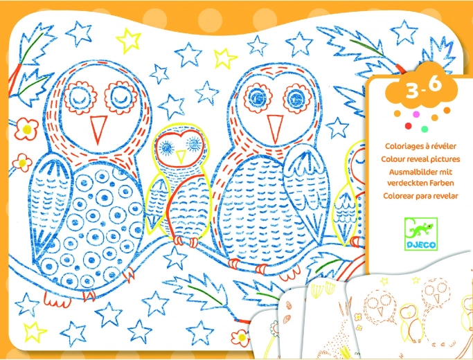 Odkrijte zabavo s čarobnim barvanjem znamke DJECO, ki prinaša komplet z motivi sove in njenih prijateljev. Vsaka slika se spremeni s pomočjo čarobnega čopiča in razkrije čudovite barve in podrobnosti.