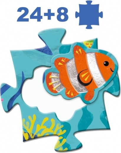 Odkrijte zabavne in poučne puzzle Djeco za male raziskovalce! Sestavite velik motiv morja iz 24 koščkov in nato dopolnite z 8 oblikovanimi koščki morskih živali na prava mesta. Spodbuja fino motoriko, logično razmišljanje in prepoznavanje živali. Idealno za otroke od 3 let.