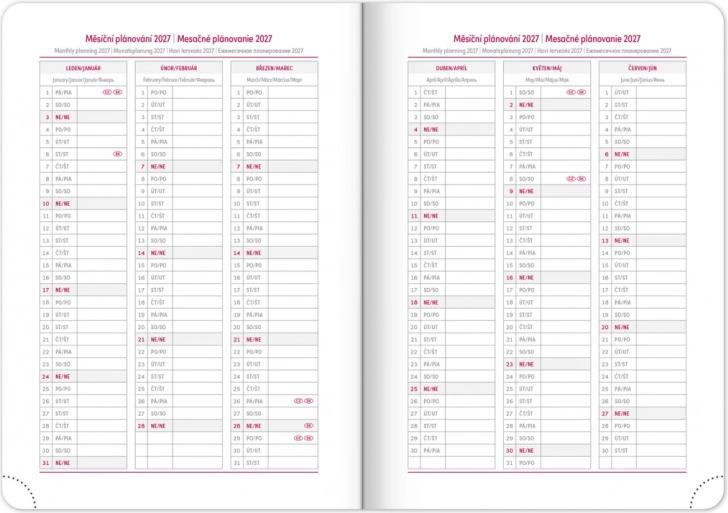Zahvaljujoč čezmejnemu in vsestranskemu koledarju, ki vključuje češko-slovaški koledar dopolnjen z angleščino, nemščino, madžarščino in ruščino, lahko zlahka načrtujete kateri koli dan ali dogodek.