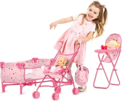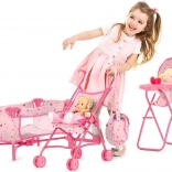 Komplet za punčke Trixy 3-v-1 Chipolino prinaša celovito rešitev za male skrbnice. V kompletu so dežnik voziček, jedilni stolček, posteljica, torba za plenice in prenosna torba. Vse komponente so zasnovane tako, da so lahke in zložljive za enostavno prenašanje in shranjevanje: