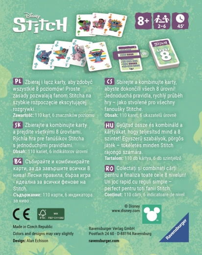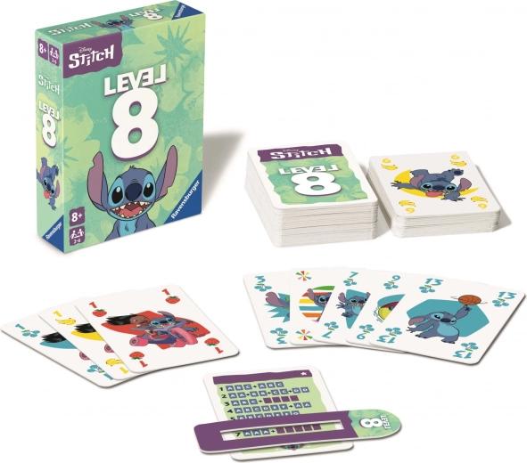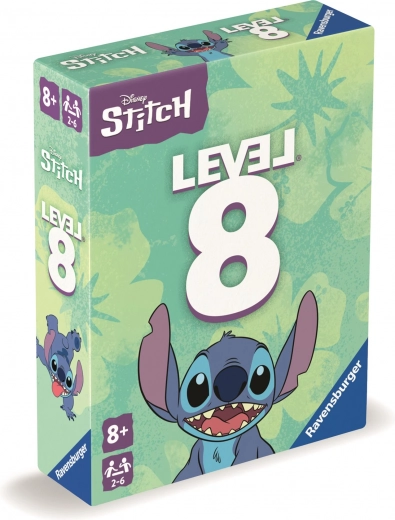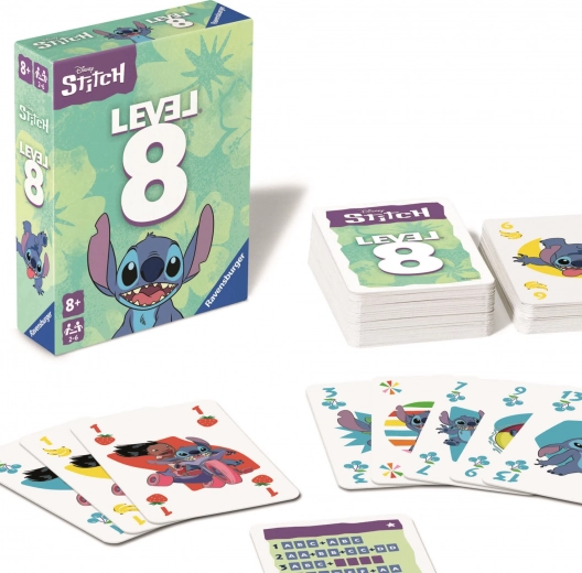 Hitra družinska kartna igra Ravensburger Level 8 Disney: Stitch. Opravite vseh 8 stopenj s pametnim kombiniranjem kart. Preprosta pravila, živahna zabava.