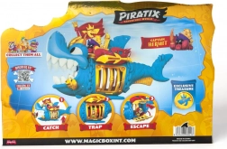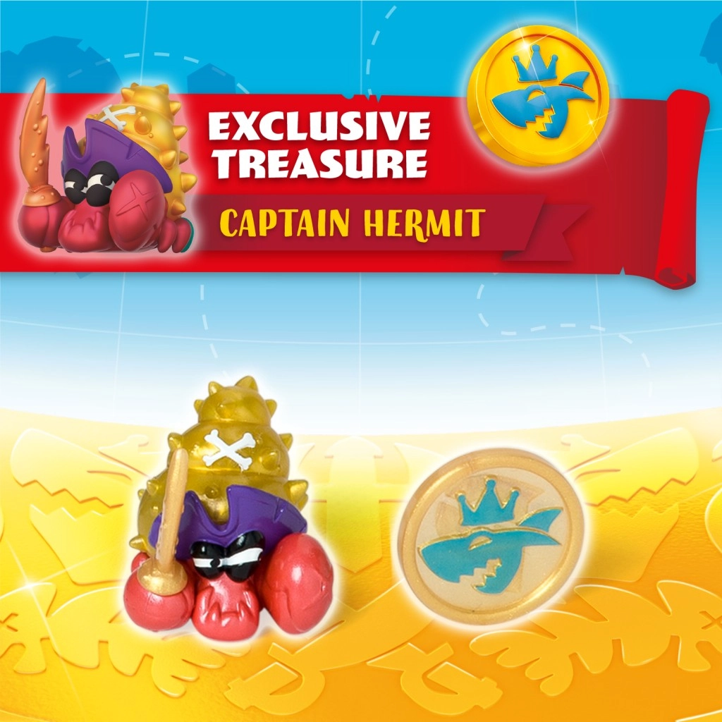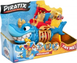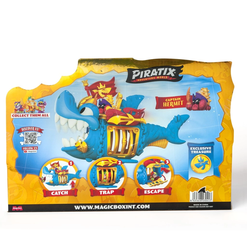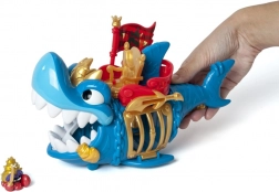 Uživajte v dodelanih podrobnostih zlato-modrega morskega psa s prestolom ter piratskega kapitana, ki je pripravljen na vsako pustolovščino.
