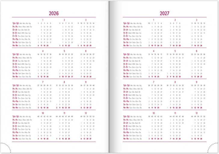 Dnevni zvezek 2026 v elegantni rdeči barvi ponuja praktičnost in slog. Vsebuje češko-slovaški koledar z razširjenimi jezikovnimi različicami in novo vtisnjenim letnikom.
