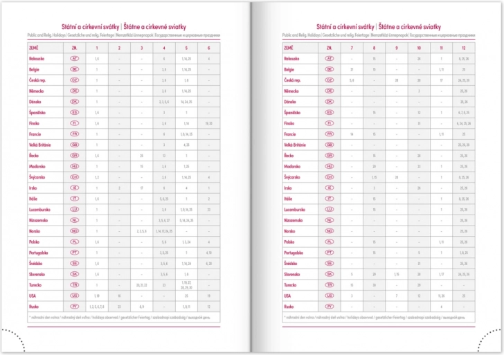 - Vsebuje delovni načrtovalni koledar in seznam praznikov Češke in Slovaške republike ter mednarodnih praznikov.