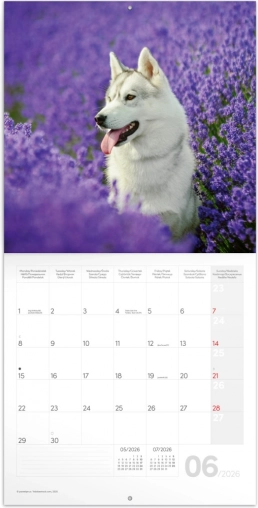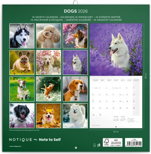 Uživajte v lepih slikah psov vsak mesec s tem koledarjem za leto 2026. Koledar vključuje: