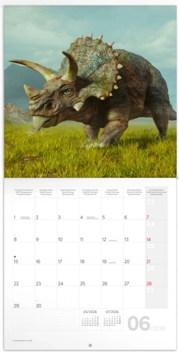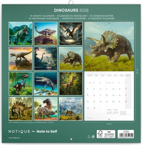 Beležniški koledar Dinozavri 2026 ponuja osupljive ilustracije prazgodovinskih dinozavrov, dopolnjene s praktičnim šestjezičnim koledarjem, ki olajša vaše vsakodnevno načrtovanje in zapiske.
