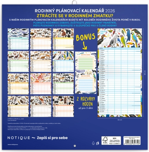Izberite Družinski načrtovalni koledar Animalium 2026 in zagotovite si lahek pregled nad aktivnostmi celotne družine. Ta koledar ponuja: