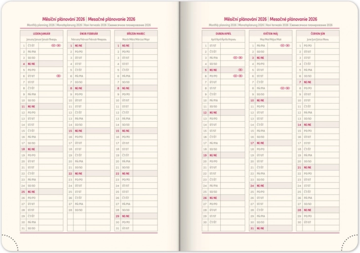 Dnevnik Diamante 2026 ponuja dnevni razpored s češko-slovaškim koledarjem in dopolnilnimi jeziki - angleščino, nemščino, madžarščino in ruščino. To je popolna izbira za organizacijo vašega časa z naslednjimi elementi: