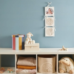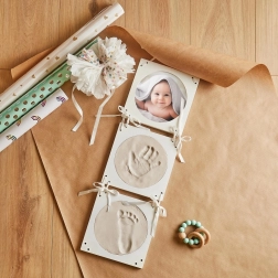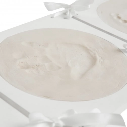 Ujemite čarobne trenutke s tem kompletom za odtise dojenčkovih ročic in nožic. Komplet ponuja elegantne okrogle okvirje s tremi okenci. Vsebuje prostor za dva odtisa in eno fotografijo vašega malčka.