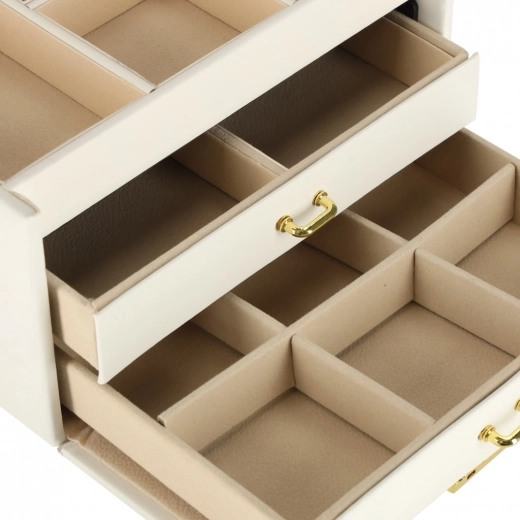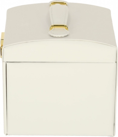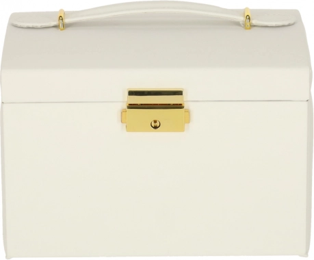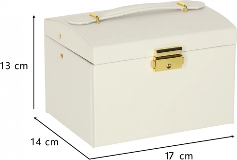 Vzdržljiva izdelava, bela izvedba z zlatimi detajli ter možnost zaklepanja na ključ zagotavljajo varno shranjevanje vaših dragocenosti doma in na poti. Škatla za nakit je lahka, kompaktna in hkrati dovolj prostorna za večjo kolekcijo.