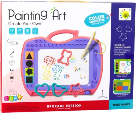 Set vsebuje štiri različne štampiljke in štiri šablone za prekrivanje, ki podpirajo razvoj ustvarjalnosti in omogočajo lahke prve korake v risanju. Barvno magnetno polje pritegne otrokovo pozornost in kompaktne dimenzije skupaj s praktično ročko omogočajo enostavno prenašanje table kamor koli - na sprehod, v avto ali na pot.