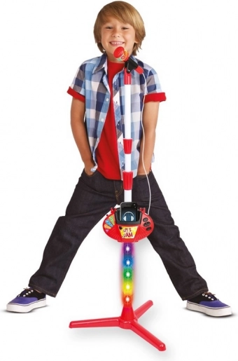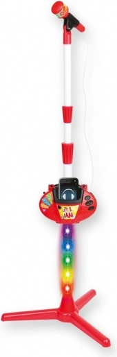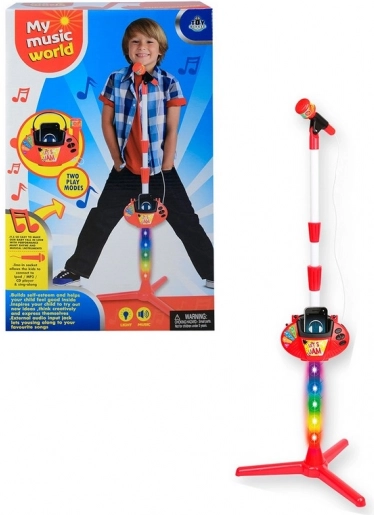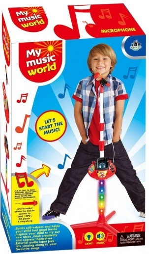 Odlična zabava za male pevce: otroški mikrofon na baterije z možnostjo priklopa zunanjih avdio naprav in utripajočimi lučmi na stojalu za še več zabave.