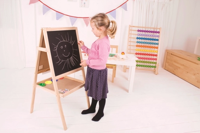 Ta večnamenska magnetna tabla za otroke ponuja na eni strani površino za suho brisanje flomastrov in na drugi strani tradicionalno kredno tablo. Med tablami se skriva palica, na katero lahko namestite papirnati trak.