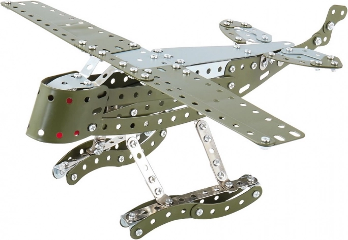 Gradbeni komplet Mali mehanik - Letalo, ki vsebuje 242 kosov, otrokom omogoča razvijanje ustvarjalnosti in ročnih spretnosti. Ta igrača združuje kovinske in plastične dele, ki se povezujejo s pomočjo vijakov in matic.