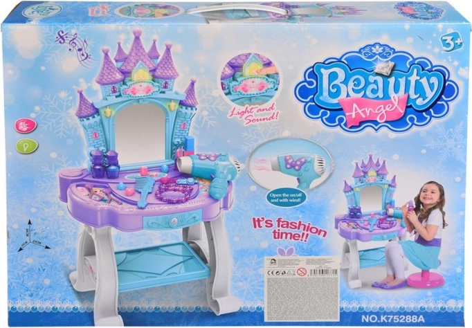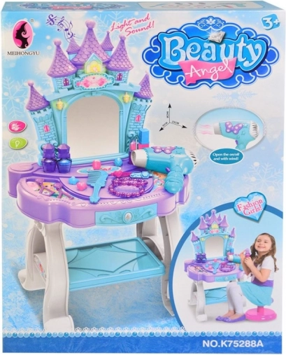 Ta čarobna kozmetična mizica je sanje vsake deklice, ki si želi biti princesa. S svojim elegantnim dizajnom in bogato okrašenim ogledalom prinaša kanček čarobnosti v otroško sobo.