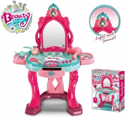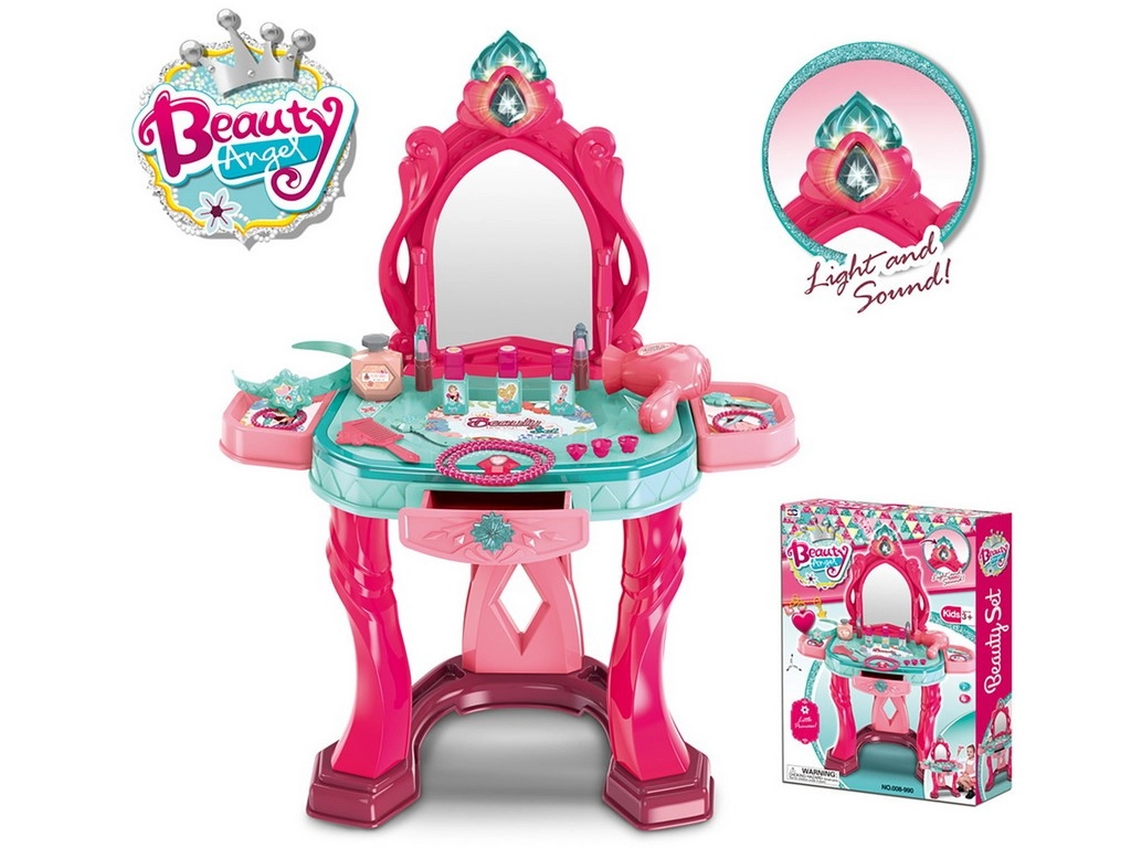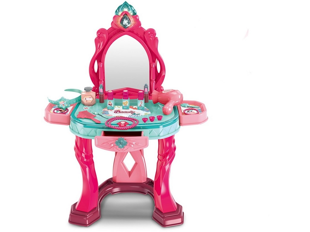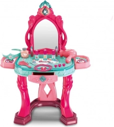 Predstavljamo čudovito toaletno mizico, idealno spremljevalko za vse deklice, ki se rade igrajo toaletne rituale svojih mamic. Ta mizica ima eleganten dizajn in je dopolnjena z svetlobnimi in zvočnimi učinki, ki zagotavljajo realističen igralni doživljaj.