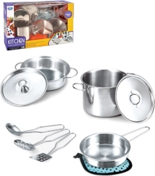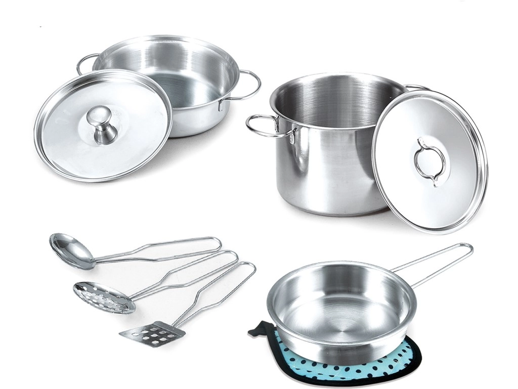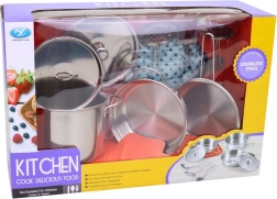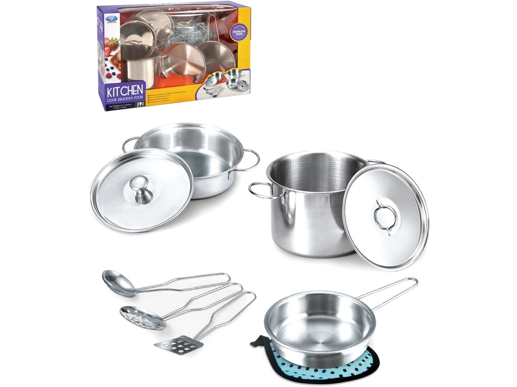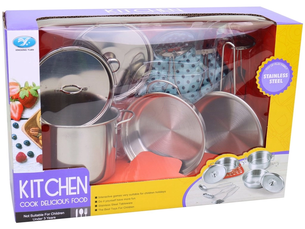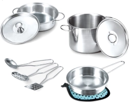 Ta set nerjavnega posodja vsebuje devet kosov, ki razširijo možnosti otroške igre v kuhinji. Pokažite svojim otrokom, kako se kuha, s tem odličnim kompletom. Posodje je izdelano iz pločevine, kar ga naredi varnega in odpornega za otroško igro. Darilna embalaža tipa window box poskrbi, da bo set odlično videti že na prvi pogled.