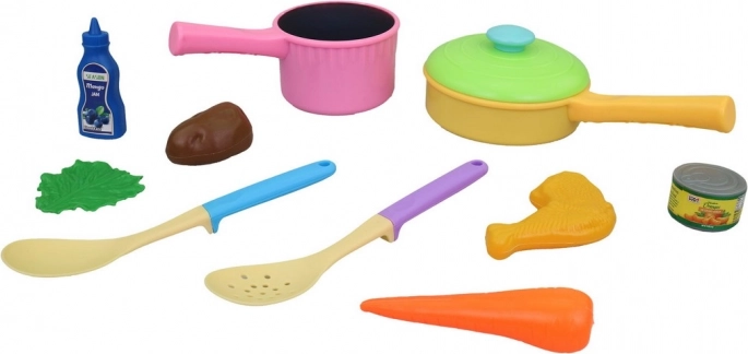 Ta kuhinjski set je popoln za male ljubitelje kuhanja. Z merami 28 x 20 cm je idealen za otroško igro. Izdelan iz trpežne plastike, zagotavlja varnost in dolgo življenjsko dobo. Pakiranje je praktično, dostavljeno v vrečki s kartico, kar omogoča enostavno shranjevanje.