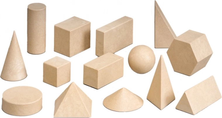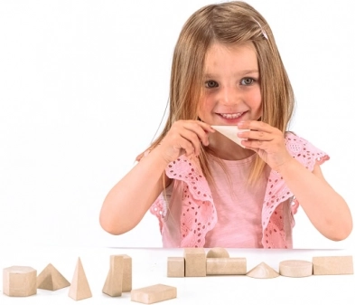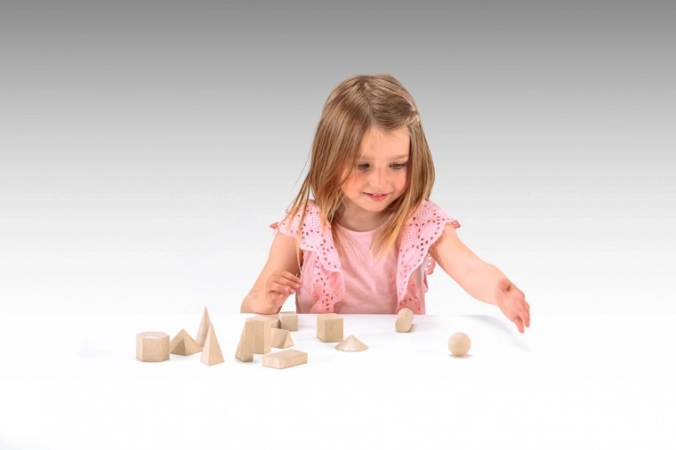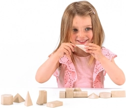 Ta lesena zbirka vsebuje 14 različnih geometričnih teles, ki služijo kot idealno orodje za zgodnje učenje geometrije. Otroci se naučijo prepoznavati oblike, kot so kocka, pravokotnik, prizma, valj, piramida, stožec in krogla.