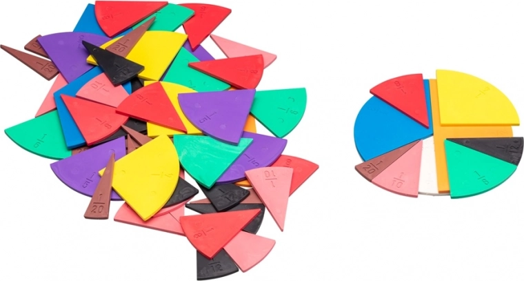 Ta komplet s 71 deli je idealen za učne namene in otrokom pomaga razumeti osnove računskih operacij z ulomki. Vsak košček je označen z ustreznim ulomkom: