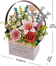 RoboTime 3D lesena sestavljanka Cvetlična Košara prinaša edinstveno ustvarjalno izkušnjo. Cvetlice, kot so rožnata lilija, rdeča vrtnica in rožnat nagelj, simbolizirajo občudovanje, strast in hvaležnost. 3D modeliranje spodbuja razvoj fine motorike, logičnega razmišljanja in potrpežljivosti. Odlična dekoracija ali darilo za ustvarjalne duše. Sestavljanka vsebuje 428 kosov natančno lasersko izrezanih delov, ki se preprosto zaskočijo skupaj in tvorijo stabilen ter trpežen model. Košara ima odprtine za enostavno postavitev cvetlic po vaši domišljiji.