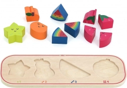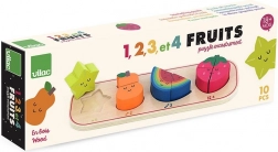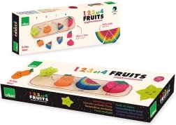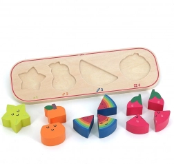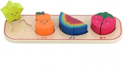 Ta zabavna in izobraževalna sestavljanka otrokom prinaša veselje do odkrivanja in učenja skozi igro. Vsak košček sadja, kot so rumena karambola, oranžna hruška, pisana lubenica in rdeča jagoda, prihaja v različnih količinah koščkov za vstavljanje v leseno podlago. Otroci se učijo prepoznavati oblike, barve in ustrezne številke, kar naravno razvija njihovo fino motoriko in koordninacijo roka-oko.
