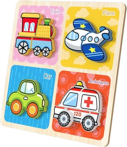 Lesene sestavljanke velikosti 30 x 30 cm vsebujejo slike štirih različnih prometnih sredstev, ki igri dodajo privlačnost in izobraževalno vrednost. Otroci se s temi sestavljankami ne le igrajo, temveč tudi urijo svoje finomotorične sposobnosti in logično razmišljanje, kar je idealno za otroke od 3. leta starosti.