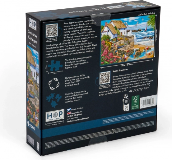 Sestavljanka Koča na obali s 1000 kosi ponuja edinstvene in nepravilne oblike, ki povečujejo zabavo in izziv pri sestavljanju.