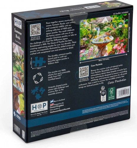 Sestavljanka Poletne ptice podjetja House of Puzzles prinaša zabavo s 1000 koščki, ki imajo edinstvene in nepravilne oblike, kar povečuje izziv in užitek pri sestavljanju.
