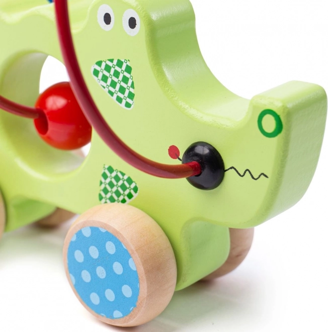 Leseni krokodil s krogličnim labirintom je idealna igrača za majhne raziskovalce. Njegova barvita zasnova pritegne pozornost otrok in jih uči koordinacijo gibov. Ta igrača je izdelana iz kakovostnih in varnih materialov, ki izpolnjujejo evropske varnostne standarde. Kroglični učinek koles omogoča, da se krokodil enostavno premika in otroci lahko igračo brez težav prestavljajo.