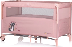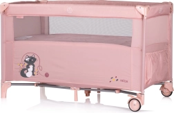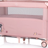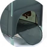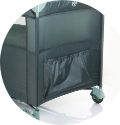 Opremljena je z dvema kolesoma z zavoro za lahkotno premikanje. Poleg tega se zlahka zloži in razpre, kar zagotavlja hitro pakiranje za na pot. Paket vsebuje zložljivo posteljico, vzmetnico, drugo raven posteljice in praktično torbo za prenašanje ter shranjevanje.