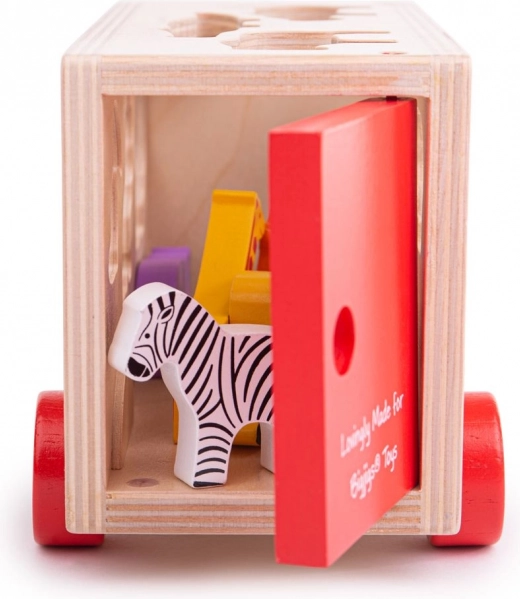 Ta pisano obarvana lesena igrača vsebuje prepoznavne živalske oblike, ki jih je mogoče naložiti na tovorno vozilo s posebnimi odprtinami na strehi in straneh vozila. Otroci lahko razvrščajo oblike in se učijo o različnih živalih, nato vsako žival vstavijo v pravilno odprtino. Ko so vse živali na svojem mestu, se zadnja vrata tovornjaka zaprejo in lahko se odpravijo na novo avanturo.