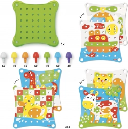 V paketu so plastična osnova, tri obojestransko ilustrirane kartice in skupaj 40 barvitih čepov. Otroci lahko sestavljajo po predlogah ali ustvarjajo lastne slike – zabava, ki raste skupaj z njimi.