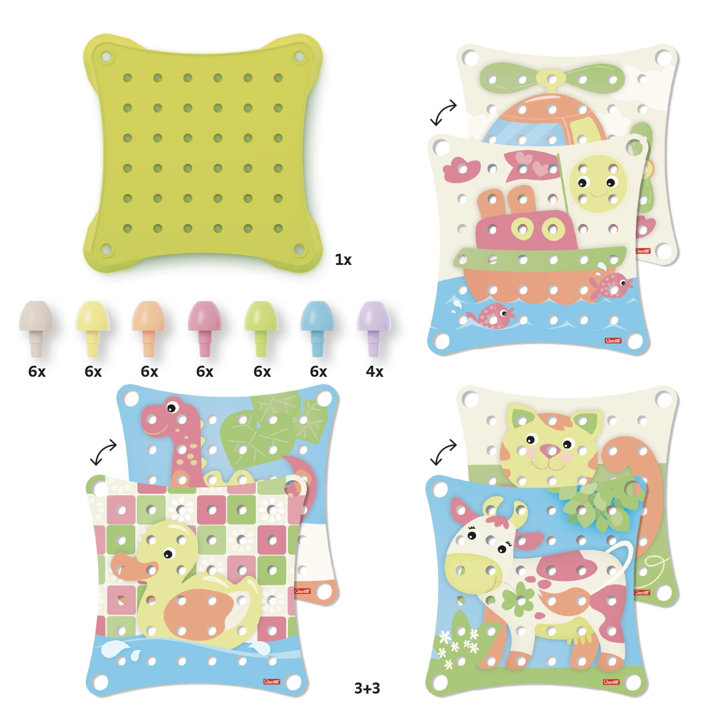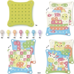 Odkrijte svet barv in oblik z mozaikom *Jumbo Peggy Evo*. Posebej zasnovana za otroke od 2 let, ta igrača razvija njihovo *ustvarjalnost* in *ročne spretnosti*. Otroci lahko ne le vstavljajo ključke v ilustrirane perforirane kartice, temveč iz njih tudi gradijo *visoke stolpe*, kar spodbuja njihove konstrukcijske sposobnosti.