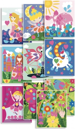 Komplet vsebuje 10 natisnjenih slik (21 × 17 cm) in 5 listov nalepk z motivi, kot so vila, princesa, poni, samorog in drugi. Praktičen etui služi tudi kot prostor za shranjevanje za nadaljnje ustvarjanje.