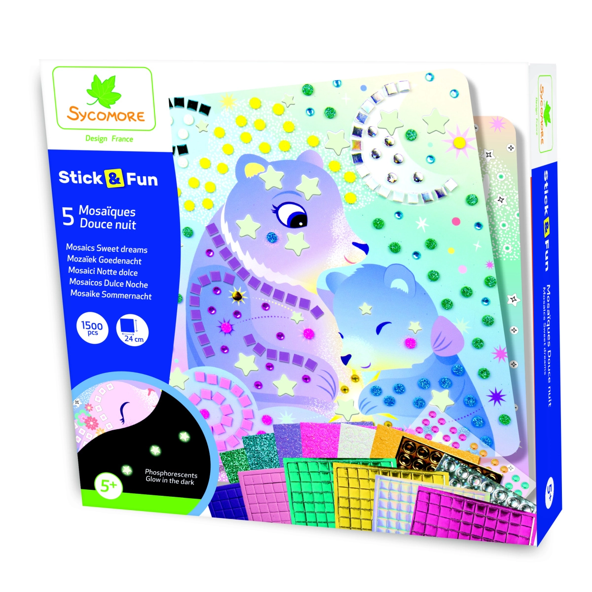 Uživajte v ustvarjalni prostočasni zabavi z mozaičnimi slikami, polnimi domišljije. Otroci lahko s penastimi koščki in fosforescentno mozaiko okrasijo 5 različnih slik: samorog, pavo, delfin, zajec in medved. Zahvaljujoč fosforescentnim lastnostim se slike v temi zasvetijo, če so bile prej izpostavljene svetlobi.