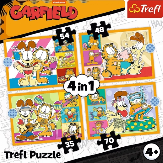 Sestavljanka Garfield znamke TREFL: set 4v1 z različno težavnostjo, idealen za oboževalce Garfielda. Razvijajte spretnosti s 35–70 koščki.
