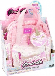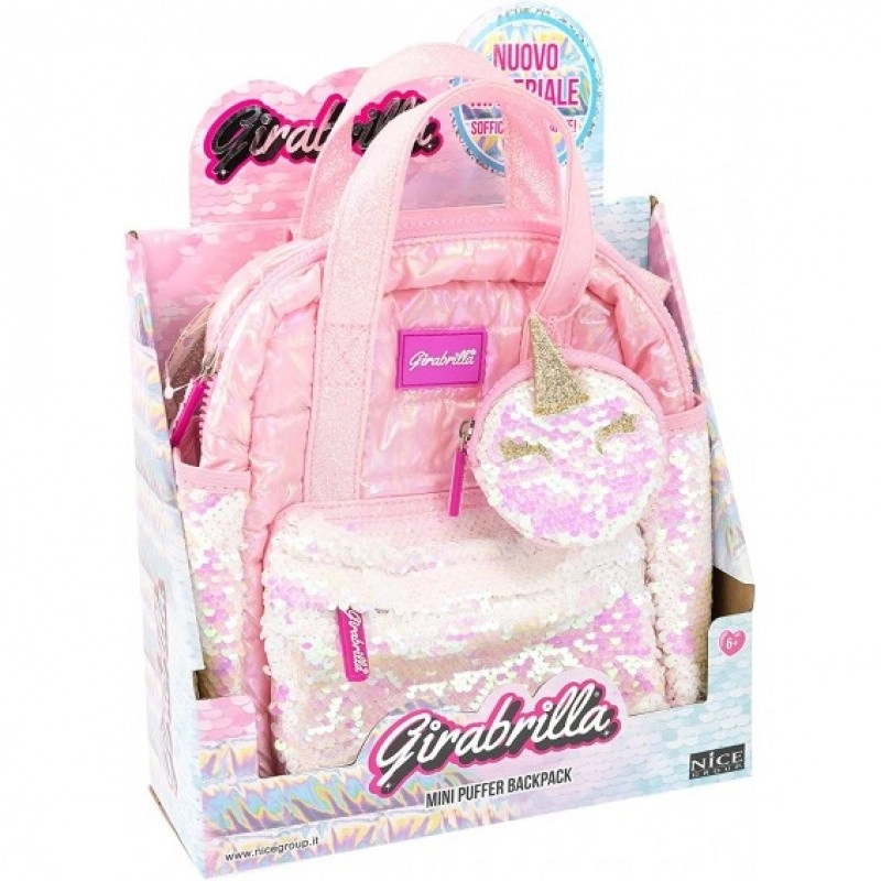 Slogovno roza mini nahrbtnik izdelan iz mehke, opalizirajoče tkanine vsebuje barvite bleščeče žepe in edinstveno denarnico v obliki samoroga.