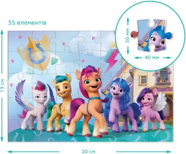 Zabava z My Little Pony se začne s to odlično sestavljanko. Uživajte v sestavljanju in odkrivajte čudovito sliko z motivom priljubljenih likov My Little Pony. Vsak od 35 kosov je zasnovan tako, da razveseli male oboževalce.