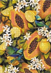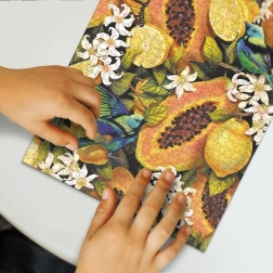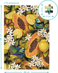 Odkrijte vsak detajl te čudovite uganke, kjer se barvni in podrobni prikazi tropskega sadja srečujejo s skrbno oblikovanimi kosi, ki se natančno prilegajo skupaj. Po dokončanju ima uganka približne dimenzije 48 x 64 cm.