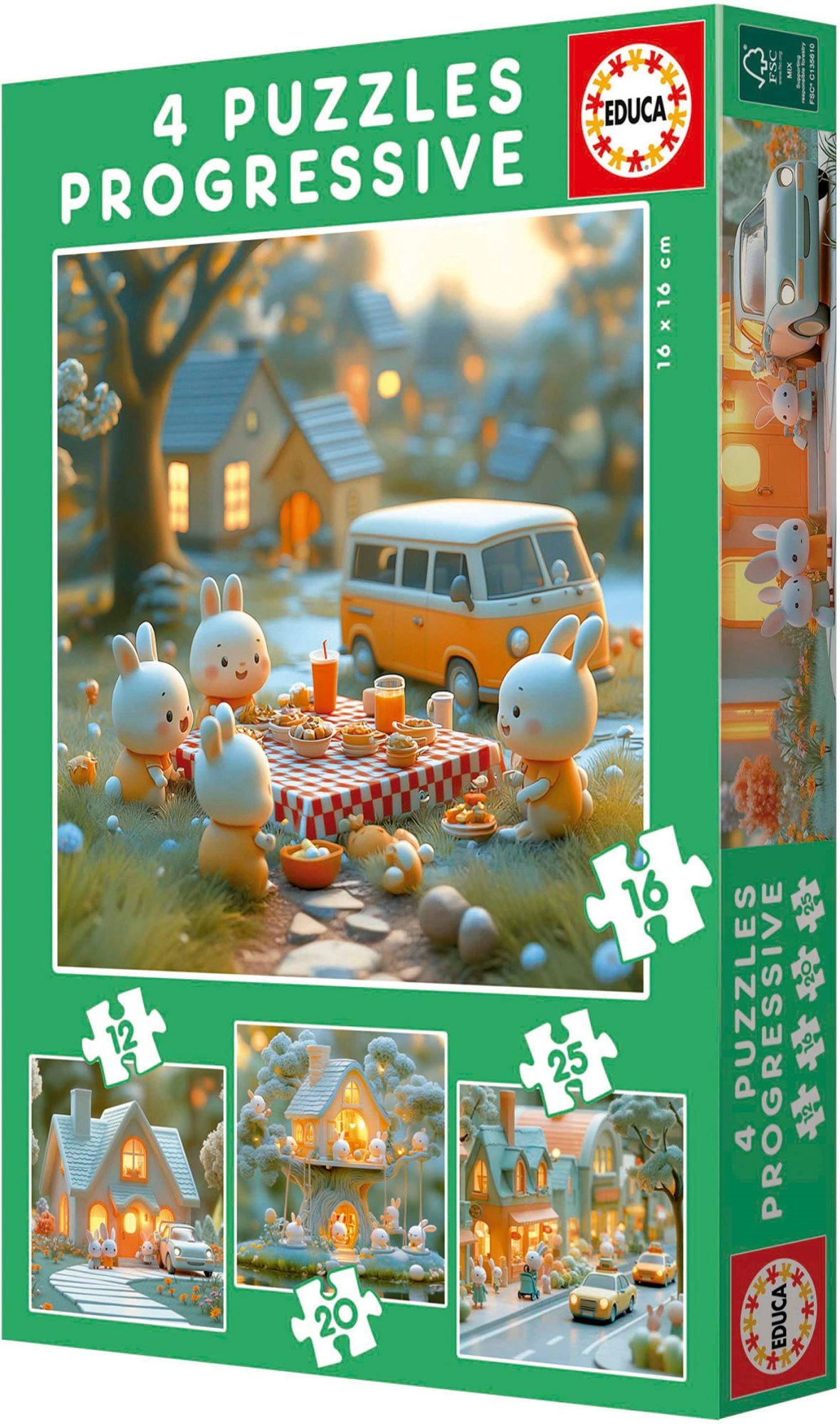 Odkrijte veselje do sestavljanja s setom EDUCA Zajčje mesto 4v1. Set ponuja štiri različne sestavljanke z postopnim povečevanjem zahtevnosti: