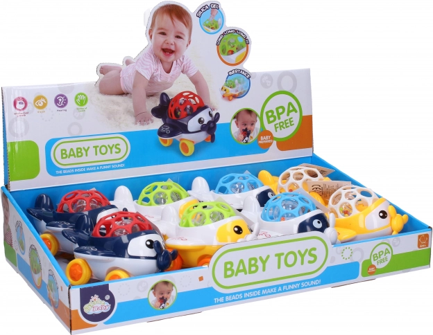 Igrača v obliki letala s prostimi kolesi je popolna za zabavo in razvoj otrok. Te ropotuljice so na voljo v štirih barvnih različicah: modra, zelena, bela in rdeča. Zaradi velikosti 11×11×8 cm jo otroci zlahka primejo in z njo upravljajo.