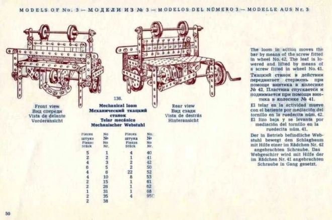 Priložena je obsežna, v slogu obdobja oblikovana 94-stranska knjižica z navodili s slikovnimi postopki. Navodila dopolnjujejo izvirna besedila v angleščini, nemščini, španščini in ruščini ter so zasnovana za komplete MERKUR classic C03, C04 in C05.